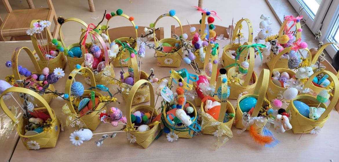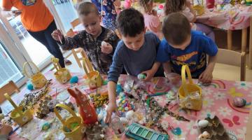 Dzieci z ogromnym zaangażowaniem tworzyły własne koszyczki wielkanocne z różnych materiałów, pięknie je ozdabiały, a także malowały jajka kolorowymi farbkami.