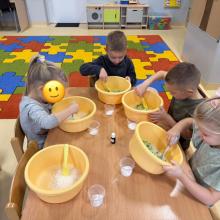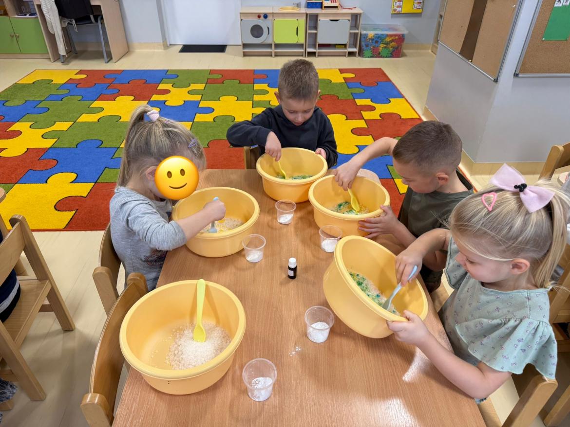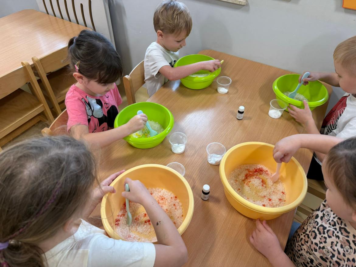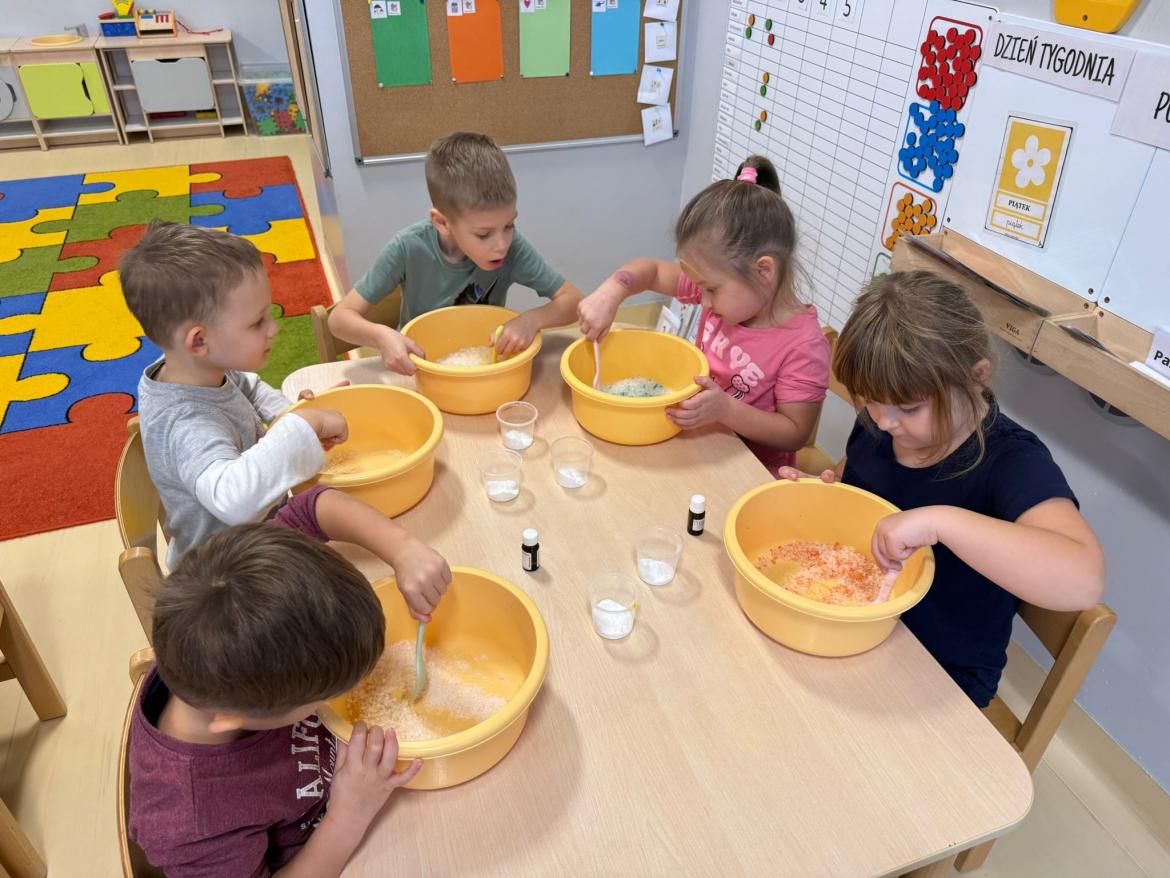 Rybki wzięły udział w warsztatach 🐠Przedszkolaki zamieniły się w prawdziwych chemików i stworzyły swoją własną sól do kąpieli 🛁 Eksperymenty pobudziły zmysł wzorku 👁️ dotyku 🤚🏻i zapachu 👃🏻To świetna przygoda, dzieci wróciły do domu z wyjątkową i samodzielnie przygotowaną mieszanką.