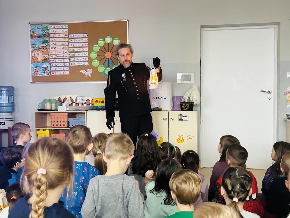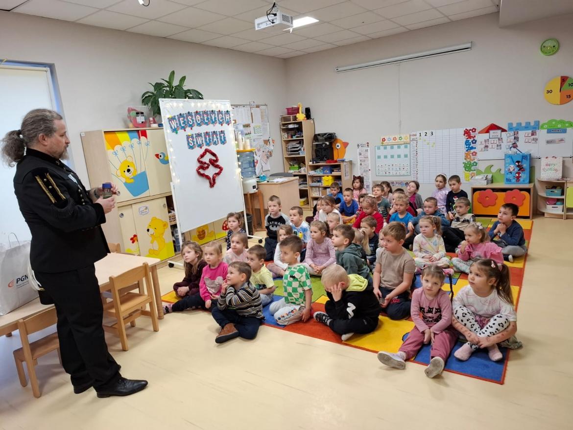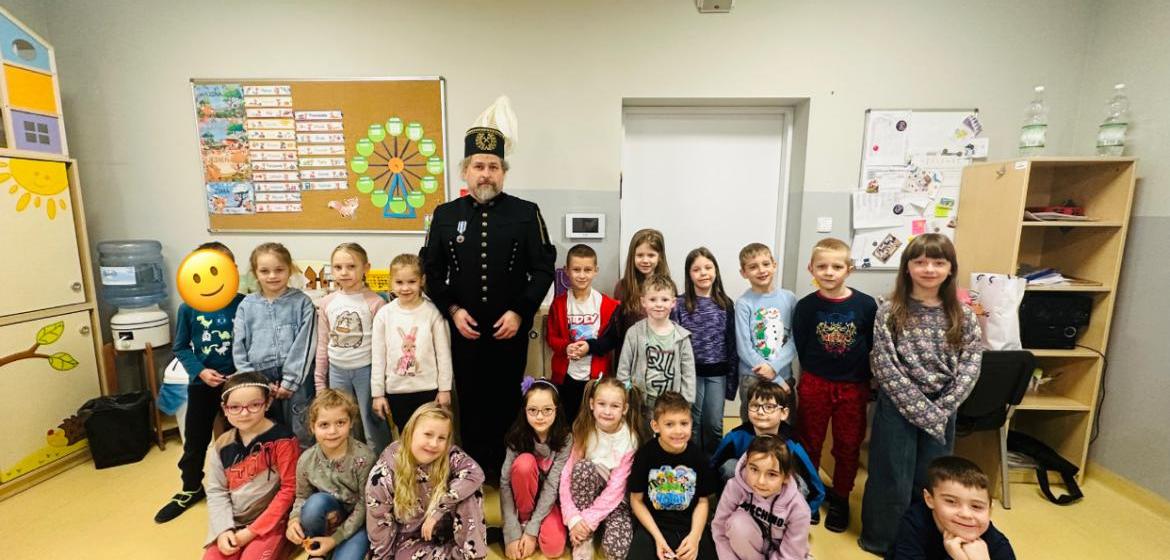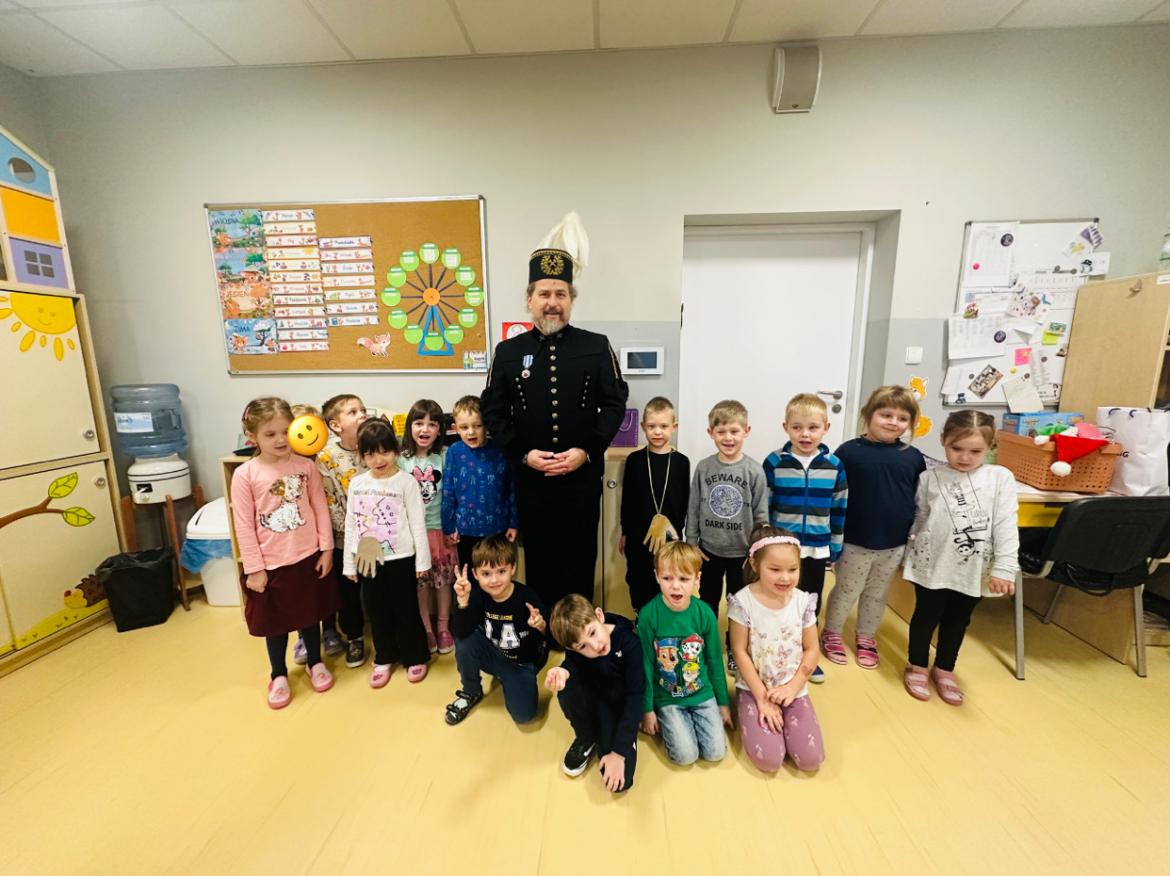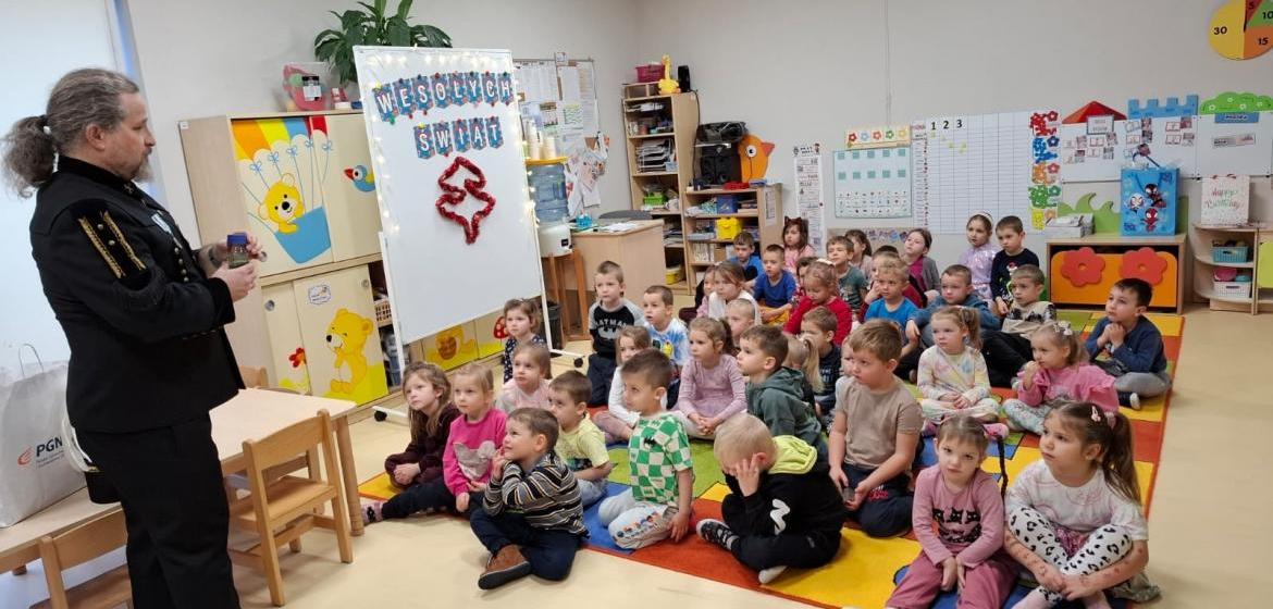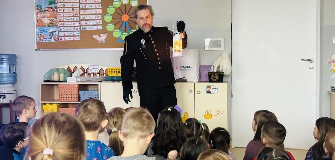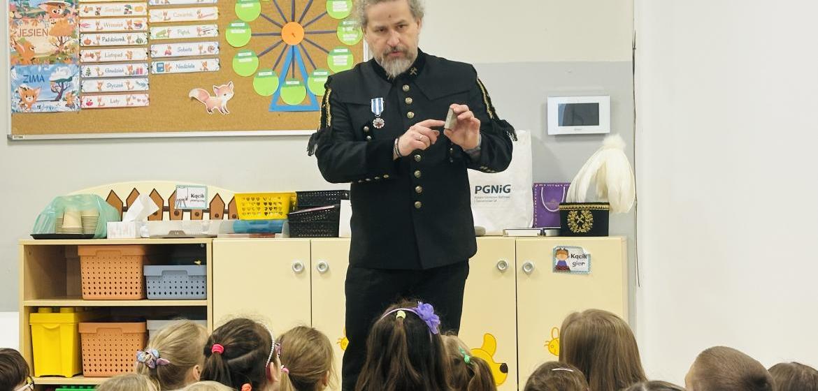 4 grudnia jest szczególnym dniem, w którym swoje święto obchodzą górnicy. W związku z tyM nasze przedszkole odwiedził górnik - pracownik Zielonogórskiego Oddziału PGNiG, który zapoznał dzieci z ciekawostkami o swojej pracy. Przedstawił dzieciom przepiękną historię o Świętej Barbarze – patronce górników. Przedszkolaki dowiedziały się, że górnicy wydobywają nie tylko węgiel, ale i ropę naftową i gaz ziemny. Miały okazję dowiedzieć się do czego wykorzystuje się ropę (np. do zabawek) oraz gaz ziemny. Podczas spotkania przedszkolaki miały także okazję zobaczyć górniczy strój galowy, przymierzyć kask, maskę gazową. Wraz z gościem wspólnie liczyły, ile guzików posiada jego mundur galowy. Największym zainteresowaniem cieszyła się górnicza czapka zwana – czako, na której widnieje godło górnicze (kupla) oraz pióropusz z piór kogucich. Każdy z przedszkolaków otrzymał własne czako. Górnik wyjaśnił, że kolor pióropusza jest uzależniony od rangi górnika: biały pióropusz – starsi inżynierowie i technicy, zielony – dyrektorzy kopalni, czarny pióropusz – zwykli górnicy, natomiast czerwony – członkowie orkiestry górniczej.