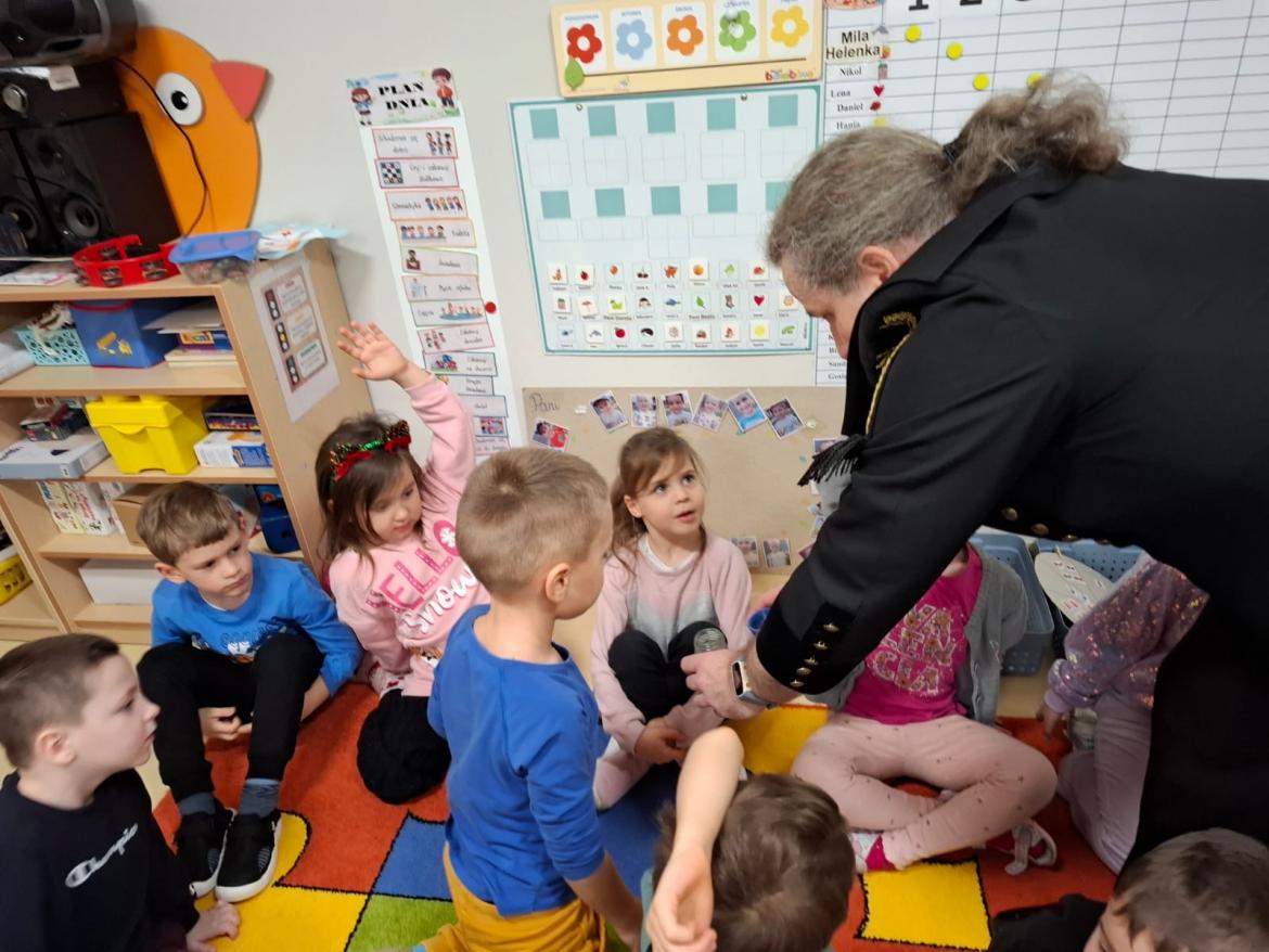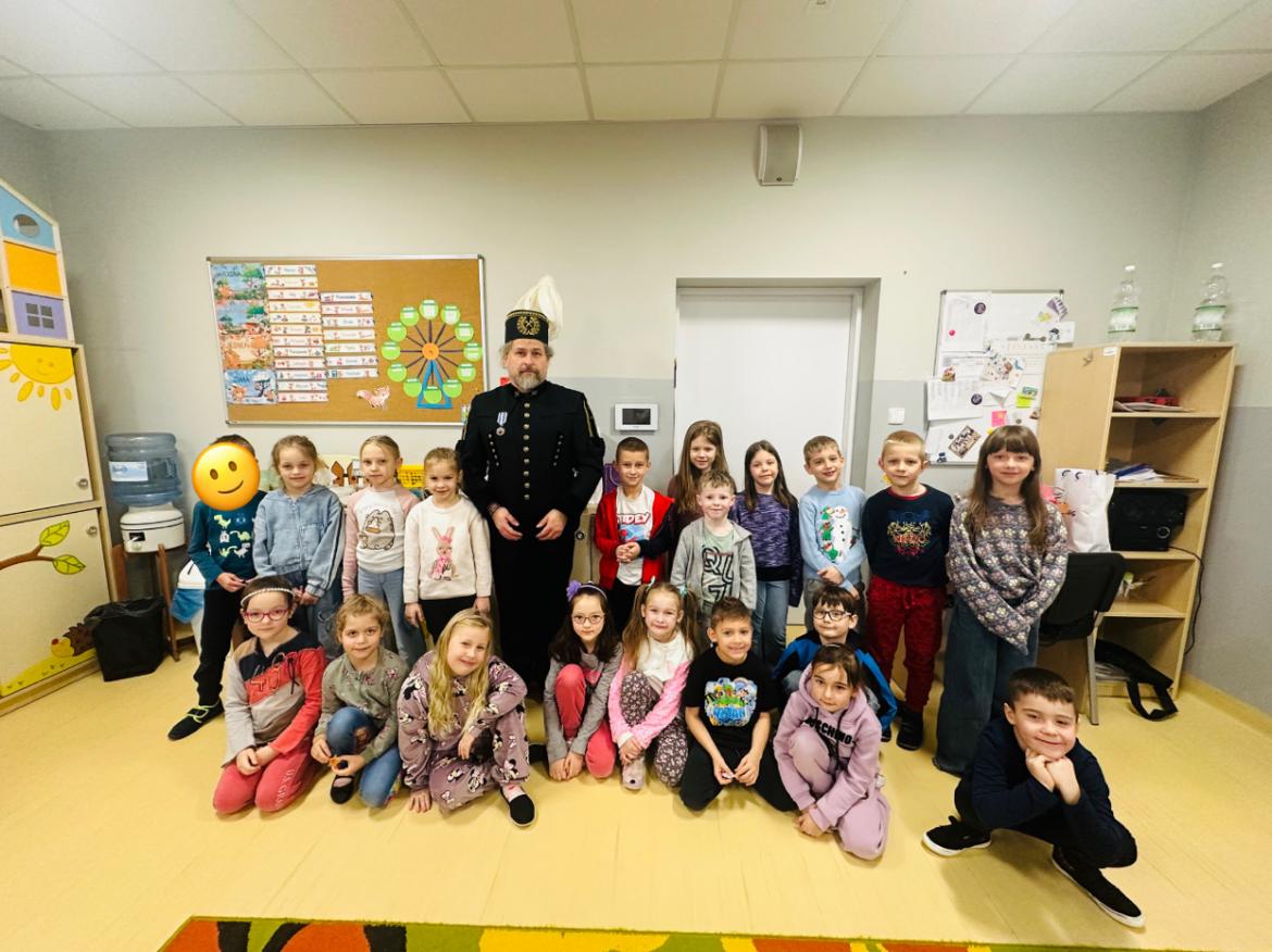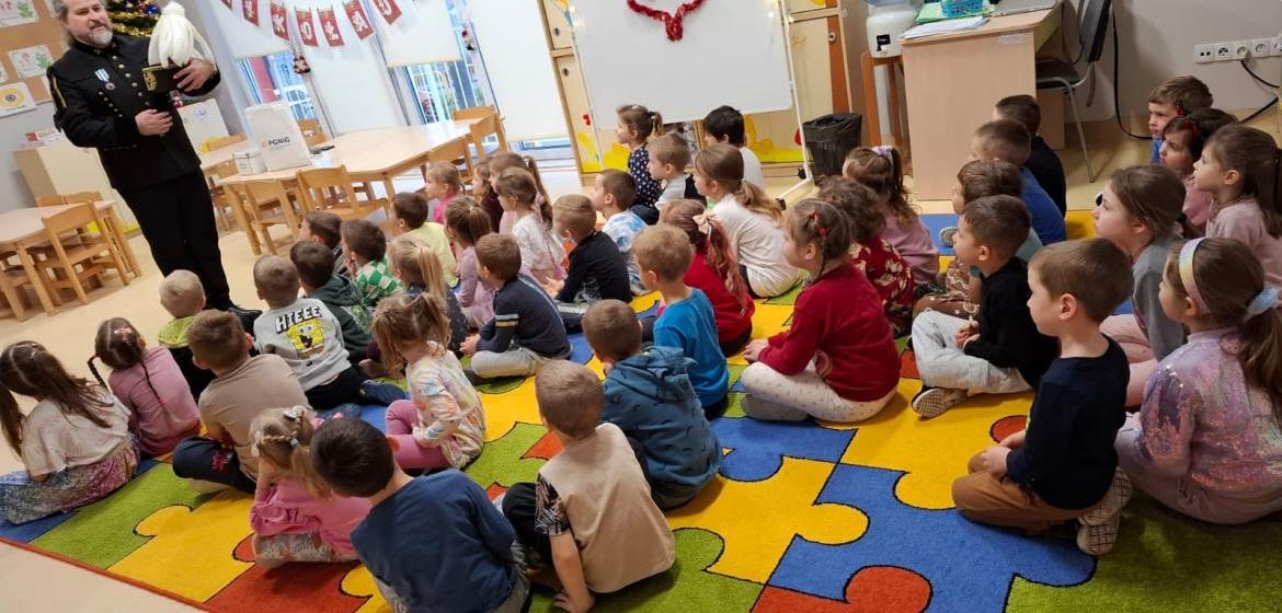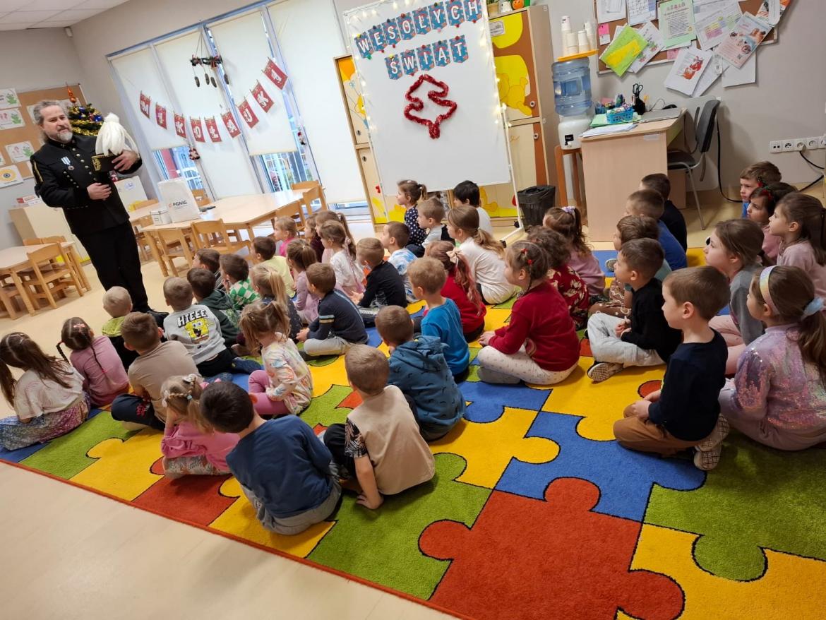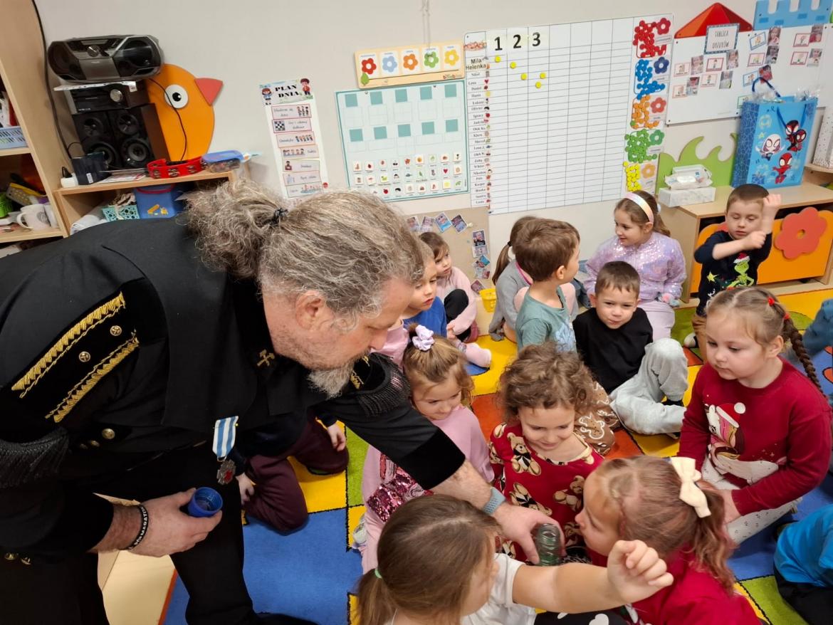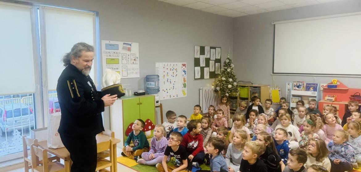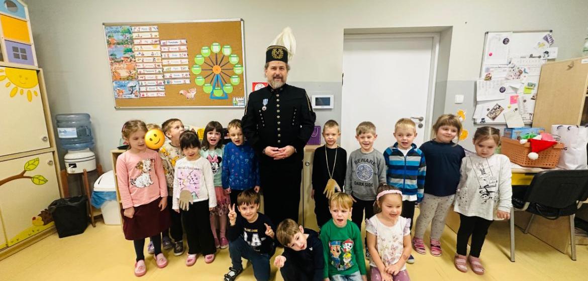 4 grudnia jest szczególnym dniem, w którym swoje święto obchodzą górnicy. W związku z tyM nasze przedszkole odwiedził górnik - pracownik Zielonogórskiego Oddziału PGNiG, który zapoznał dzieci z ciekawostkami o swojej pracy. Przedstawił dzieciom przepiękną historię o Świętej Barbarze – patronce górników. Przedszkolaki dowiedziały się, że górnicy wydobywają nie tylko węgiel, ale i ropę naftową i gaz ziemny. Miały okazję dowiedzieć się do czego wykorzystuje się ropę (np. do zabawek) oraz gaz ziemny. Podczas spotkania przedszkolaki miały także okazję zobaczyć górniczy strój galowy, przymierzyć kask, maskę gazową. Wraz z gościem wspólnie liczyły, ile guzików posiada jego mundur galowy. Największym zainteresowaniem cieszyła się górnicza czapka zwana – czako, na której widnieje godło górnicze (kupla) oraz pióropusz z piór kogucich. Każdy z przedszkolaków otrzymał własne czako. Górnik wyjaśnił, że kolor pióropusza jest uzależniony od rangi górnika: biały pióropusz – starsi inżynierowie i technicy, zielony – dyrektorzy kopalni, czarny pióropusz – zwykli górnicy, natomiast czerwony – członkowie orkiestry górniczej.