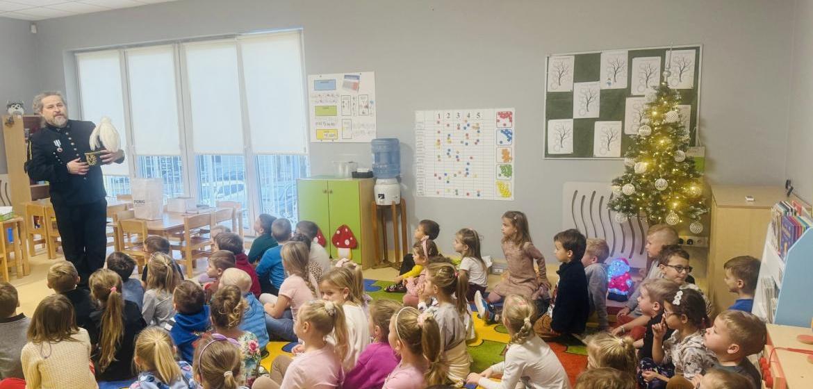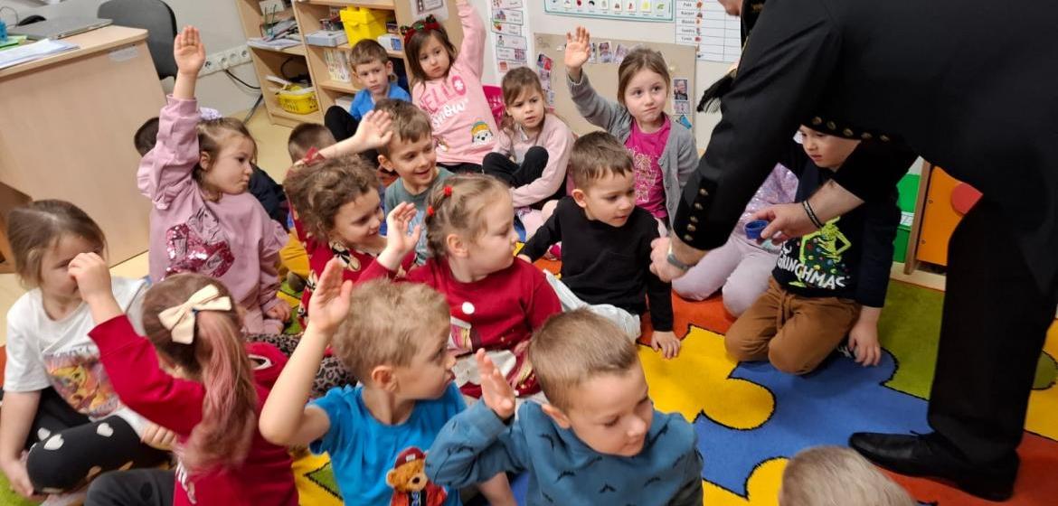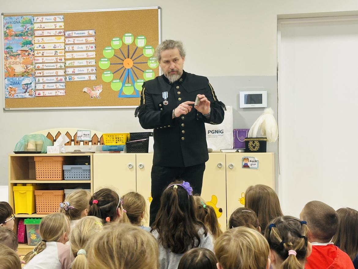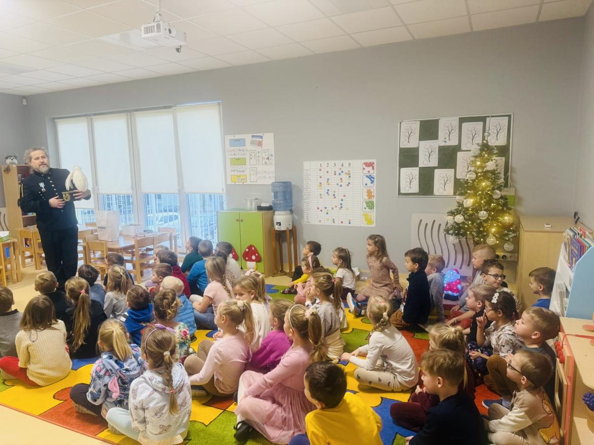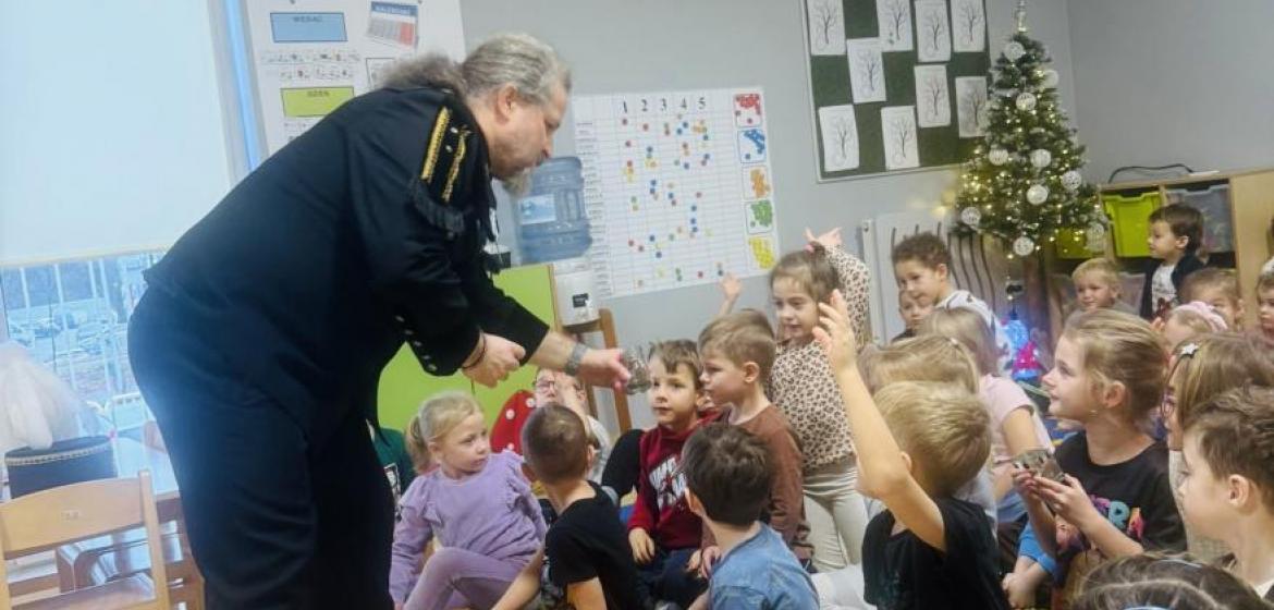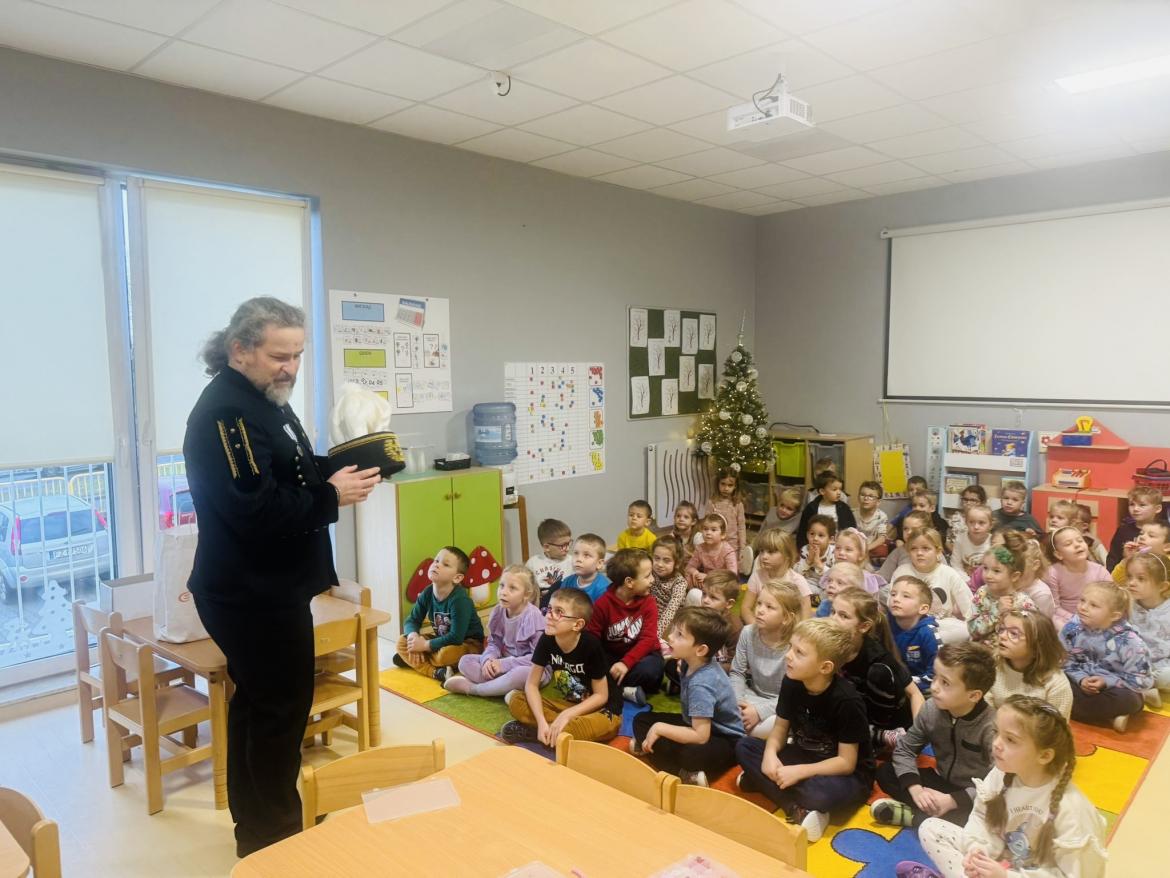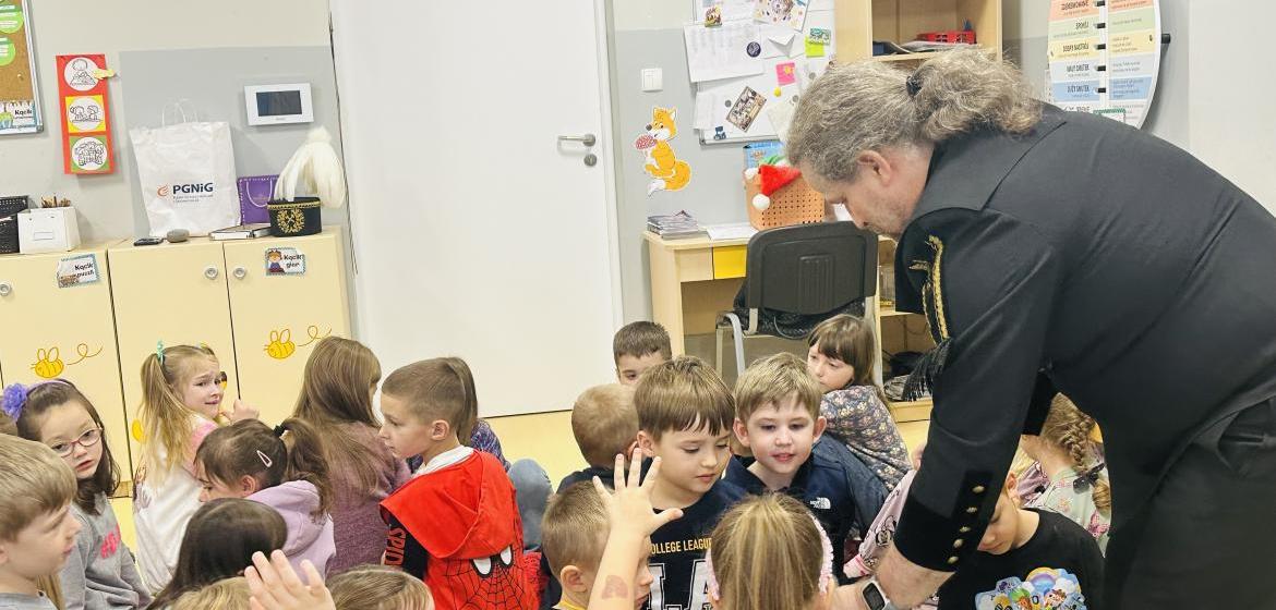 4 grudnia jest szczególnym dniem, w którym swoje święto obchodzą górnicy. W związku z tyM nasze przedszkole odwiedził górnik - pracownik Zielonogórskiego Oddziału PGNiG, który zapoznał dzieci z ciekawostkami o swojej pracy. Przedstawił dzieciom przepiękną historię o Świętej Barbarze – patronce górników. Przedszkolaki dowiedziały się, że górnicy wydobywają nie tylko węgiel, ale i ropę naftową i gaz ziemny. Miały okazję dowiedzieć się do czego wykorzystuje się ropę (np. do zabawek) oraz gaz ziemny. Podczas spotkania przedszkolaki miały także okazję zobaczyć górniczy strój galowy, przymierzyć kask, maskę gazową. Wraz z gościem wspólnie liczyły, ile guzików posiada jego mundur galowy. Największym zainteresowaniem cieszyła się górnicza czapka zwana – czako, na której widnieje godło górnicze (kupla) oraz pióropusz z piór kogucich. Każdy z przedszkolaków otrzymał własne czako. Górnik wyjaśnił, że kolor pióropusza jest uzależniony od rangi górnika: biały pióropusz – starsi inżynierowie i technicy, zielony – dyrektorzy kopalni, czarny pióropusz – zwykli górnicy, natomiast czerwony – członkowie orkiestry górniczej.