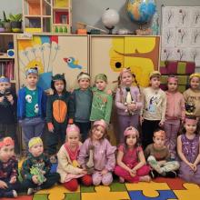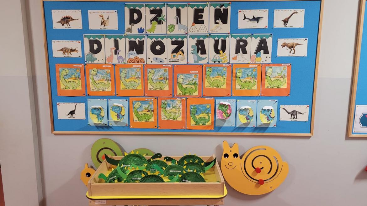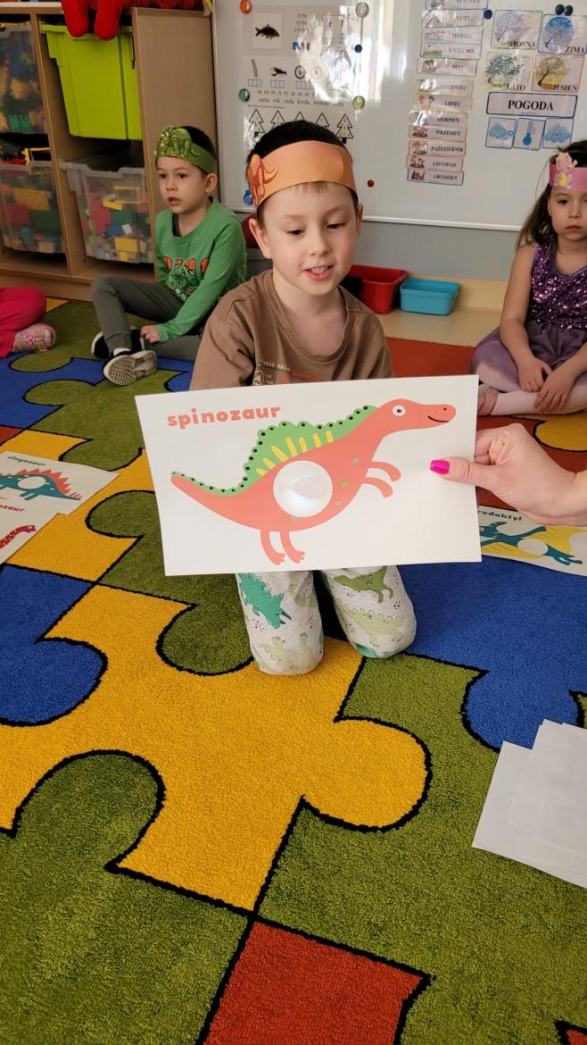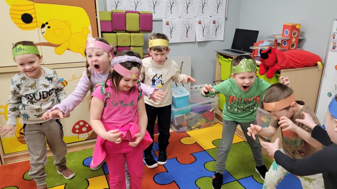 Nie zabrakło także zabaw ruchowych, wspólnego śpiewania piosenki o dinozaurach oraz pracy plastycznej, podczas której dzieci wykonały kolorowe prehistoryczne gady.