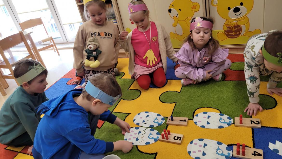 Podczas zabaw matematycznych przedszkolaki dopasowywały połówki „dinozaurowych jajek” – łączyły część z zapisaną cyfrą z odpowiednią połówką przedstawiającą właściwą liczbę kropek. Ćwiczenie to rozwijało umiejętność przeliczania, rozpoznawania cyfr oraz logicznego myślenia.