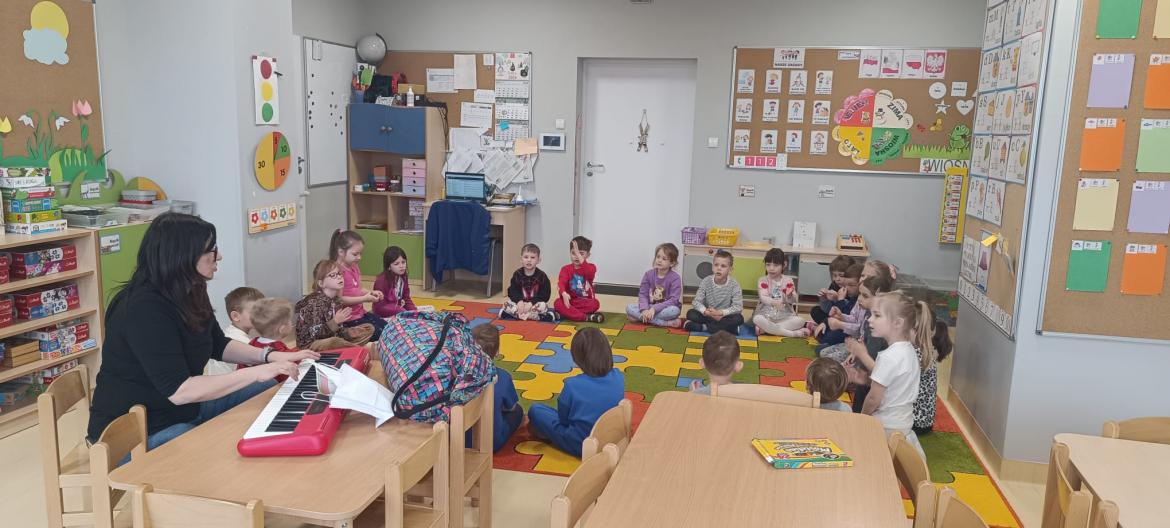 Dziś w naszym przedszkolu odbyły się wyjątkowe warsztaty muzyczne. Pani Emilia – mama Helenki z grupy Żabek – poprowadziła zajęcia dla dzieci z grup Żabki oraz Rybki.