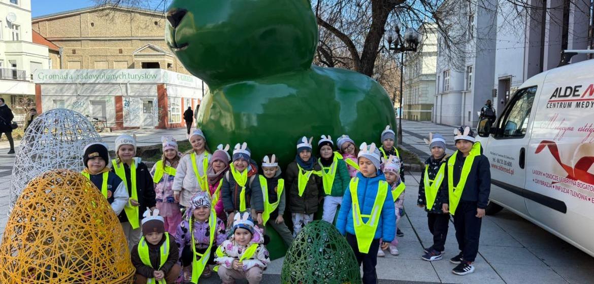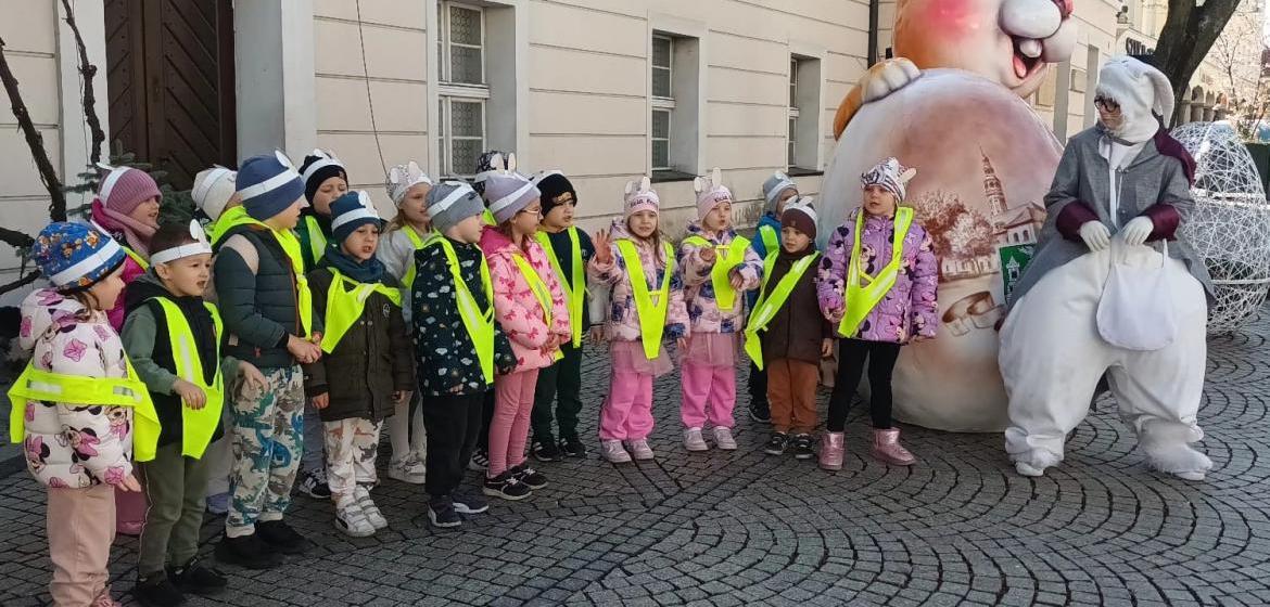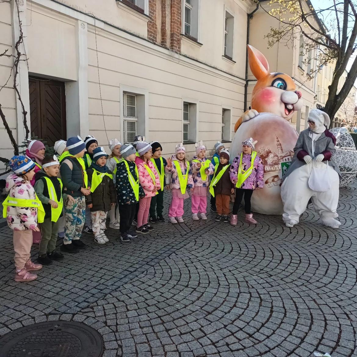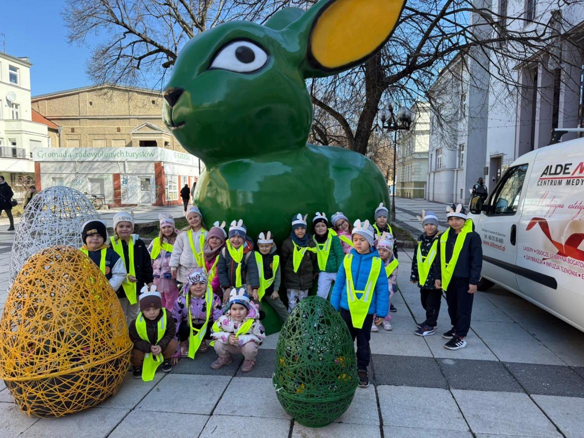 Grupa „Sówki” wzięła udział w radosnej zabawie pt. „Poszukiwanie wielkanocnego zajączka”, która odbyła się na deptaku. Dzieci z ogromnym zaangażowaniem wykonywały przygotowane zadania, rozwiązywały zagadki oraz podążały za wskazówkami ukrytymi w różnych miejscach.