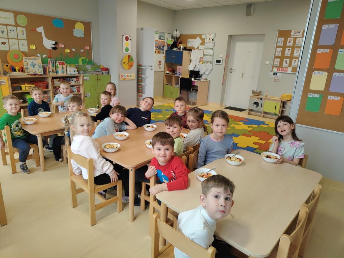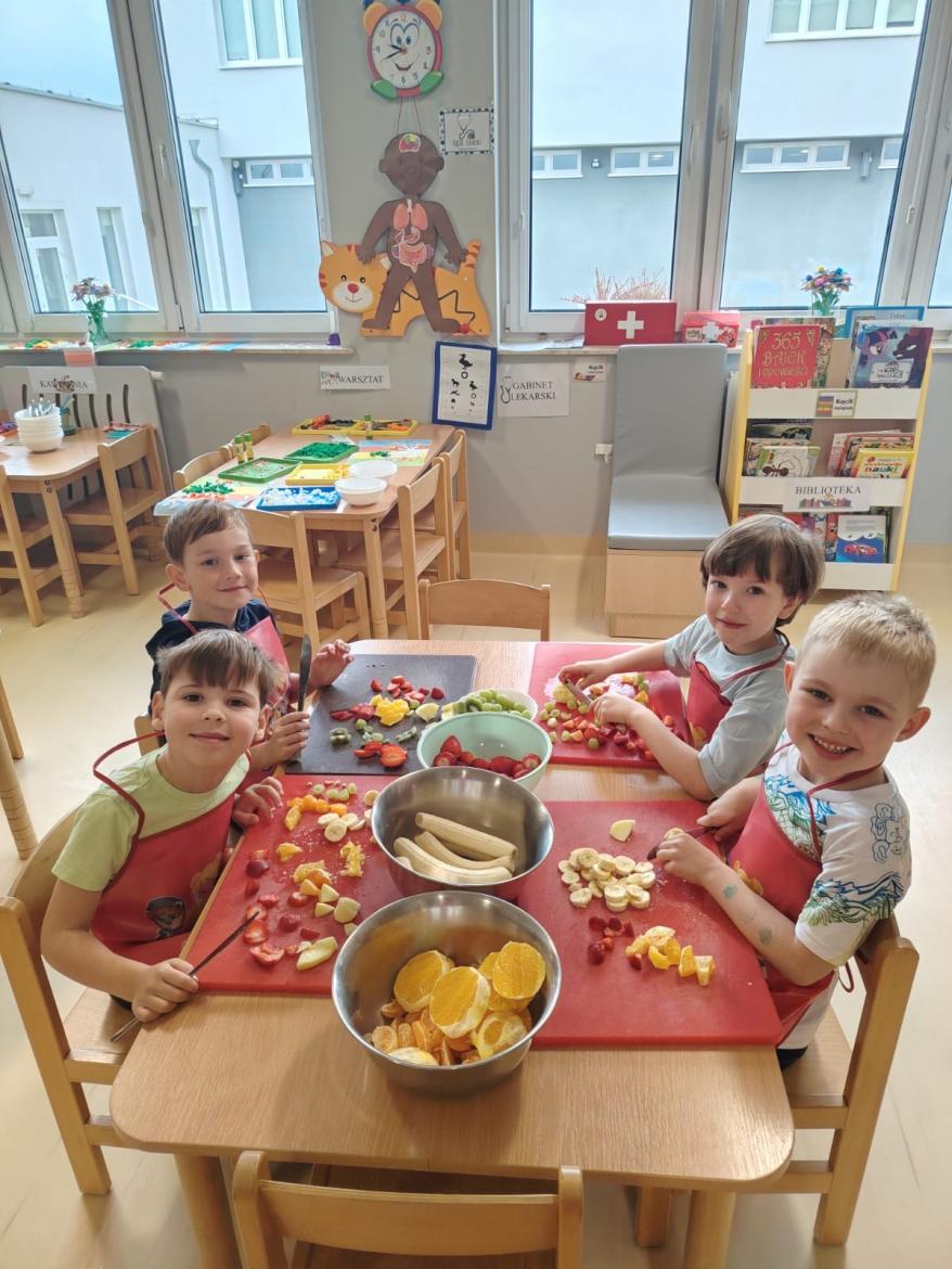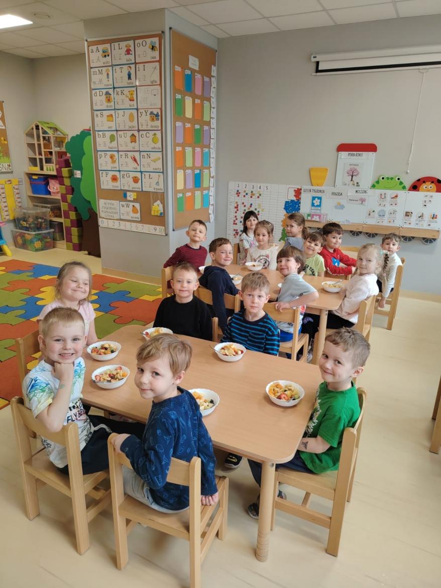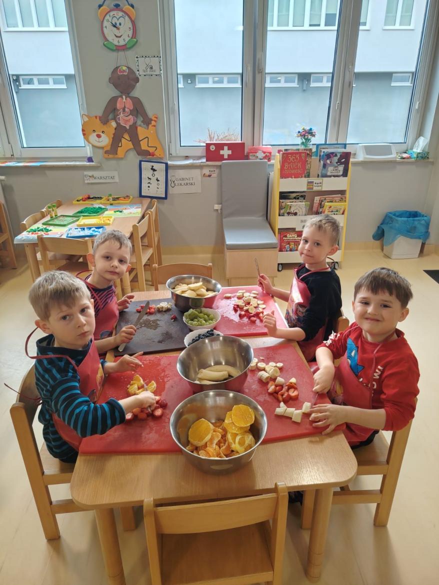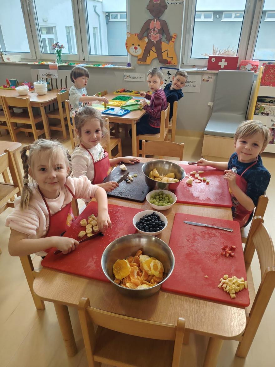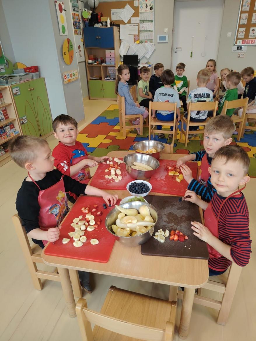 Każdy przedszkolak doskonale wie, jak smaczne i zdrowe są owoce. Zawierają mnóstwo witamin, które wzmacniają nasz organizm. Dzieci z grupy "Rybki" zrobiły dzisiaj swoją wiosenną sałatkę owocową z owoców, które przyniosły z domu. A było ich wiele - jabłka, gruszki, mandarynki, pomarańcze, banany, winogrona i borówki. Każdy ochoczo zabrał się do pracy. Nasze "Rybki" dokładnie umyły ręce, samodzielnie kroiły i przyrządzały sałatkę owocową przestrzegając zasad bezpieczeństwa posługując się nożem. Sałatka wyszła wspaniale a dzieci ja zjadły z apetytem.